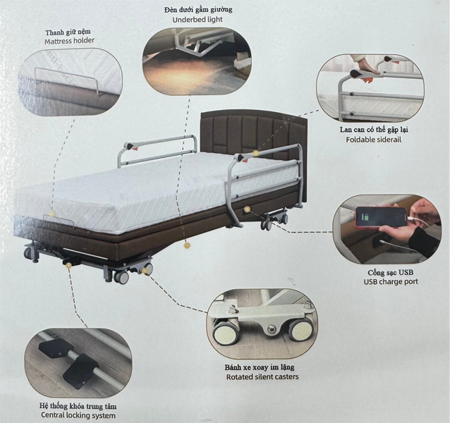 - Các chi tiết: Bánh xe có hệ thống khóa trung tậm, đèn led dưới gầm, lan can có thể gập lại, cổng sạc USB cho điện thoại, nệm mút mật độ cao 28D