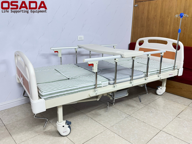 Giường y tế cho người già Osada SD-12C là giường y tế đa chức năng tay quay của Nhật Bản. Giường hỗ trợ chăm sóc bệnh nhân rất hiệu quả với các chức năng quan trọng như: Nâng hạ đầu, nâng gác chân, hạ chân kết hợp nâng đầu tạo tư thế ngồi, lật nghiêng trái - phải, bô vệ sinh. Được tích hợp thêm chậu gội đầu, bàn ăn, cọc truyền giúp giảm thiểu việc di chuyển của người già. Và đặc biệt, sự kết hợp khi dùng hai tay quay nâng đầu và hạ chân sẽ biến giường thành một chiếc ghế ngồi để người già có thể ngồi ăn uống, xem ti vi, đọc sách...