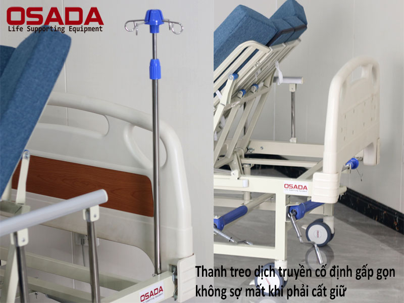 Cây treo dịch truyền thiết kế thông minh hơn được gắn cố định phía cuối giường khi sử dụng có thể kéo lên và điều chỉnh độ cao theo nhu cầu. Khi không sử dụng lại thu gọn gấp cất vào khung giường.